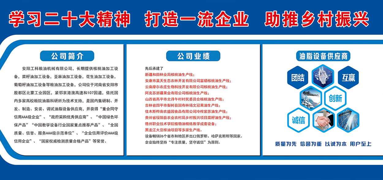 安陽工科糧油機(jī)械有限公司,長期提供核桃油加工設(shè)備,茶籽油加工設(shè)備,菜籽油加工設(shè)備,亞麻油加工設(shè)備,花生油加工設(shè)備,葡萄籽油加工設(shè)備等糧油加工設(shè)備,公司位于河南省安陽市殷都區(qū)北蒙工業(yè)園區(qū),緊鄰京港澳高速和107國道,依托國內(nèi)多家高校糧院油脂科研所為技術(shù)支持,是國內(nèi)集研制、開發(fā)、制造、安裝、調(diào)試油脂設(shè)備供應(yīng)商,并獲得“重合同守信用AAA級企業(yè)”、“政府采購優(yōu)秀供應(yīng)商”、“中國綠色環(huán)保產(chǎn)品”“中國教學(xué)設(shè)備行業(yè)國家重點(diǎn)推薦產(chǎn)品”、“全國質(zhì)量、信譽(yù)、服務(wù)AAA級示范單位”、“企業(yè)信用評價(jià)AAA級信用企業(yè)”、“國家權(quán)威檢測質(zhì)量合格產(chǎn)品”等榮譽(yù)。先后承建了新疆和田林業(yè)...